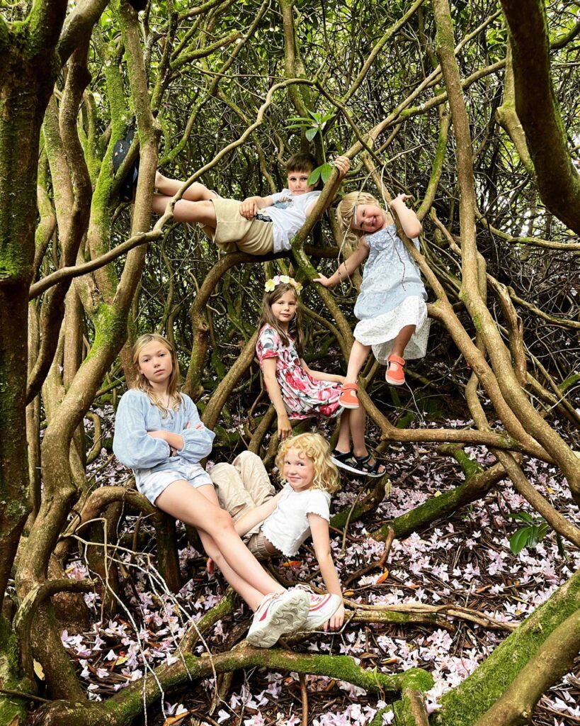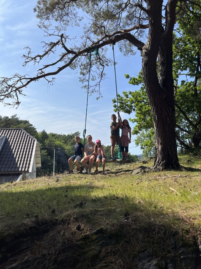 Første stopp ble Raudøya. En rolig svaieplass med nydelige omgivelser. Oppe på gressbakken, ved siden av dissa, hadde vi langturens første søndagsskole. Litt lenger oppe fant vi en eventyrskog bestående av gigantiske rododendrontrær! Der forsvant vi inn i en fantasiverden av ulike familier, kulinarisk kokkelering og ikke minst klatring mellom senger, bad, stuer og barnehager.