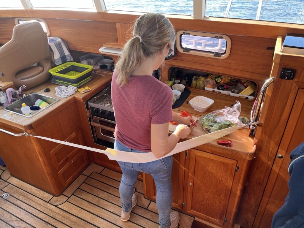 Vi fikk seilet oss inn da vi rullehoppet forbi Stadlandet. Teoline fant ut at båten ikke velter, selv i store bølger og vi fikk testa hvordan rumpestrboppen holder oss på plass når vi lager mat på skrå.