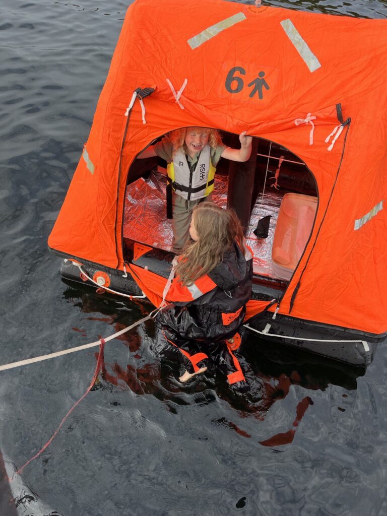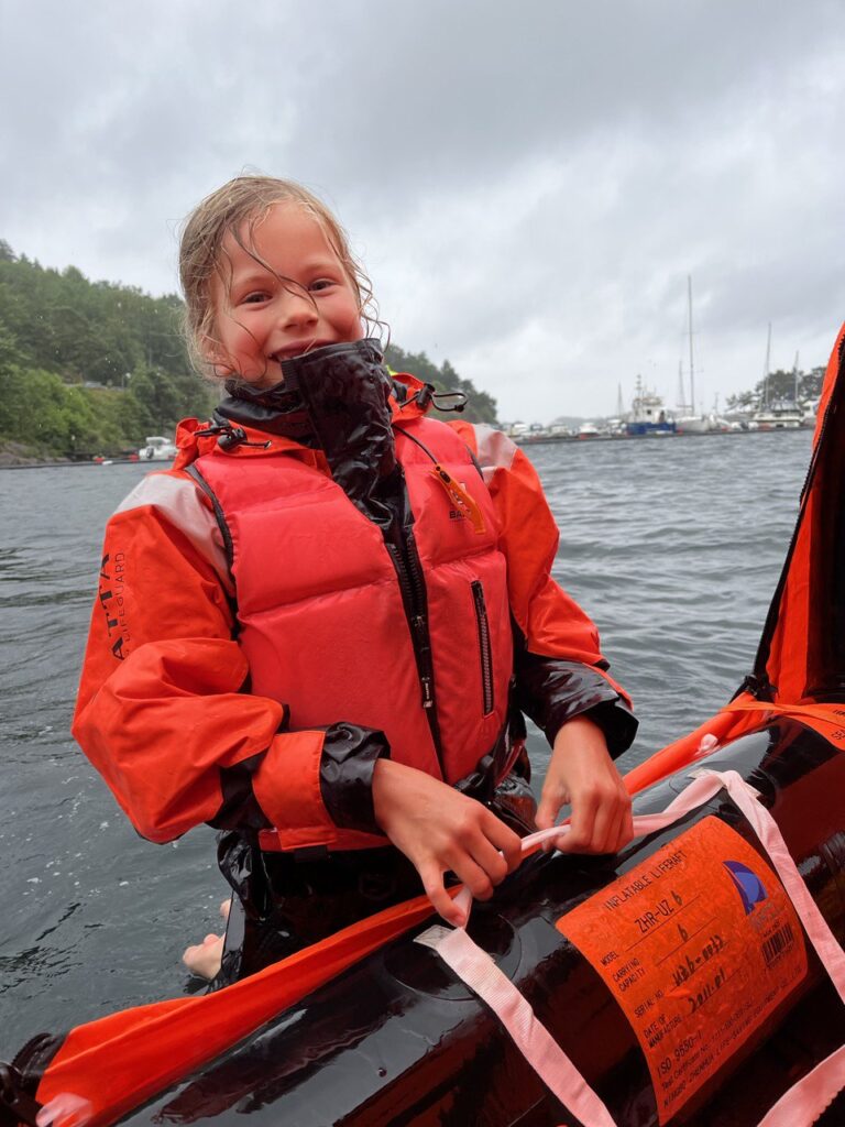 Con Awa hadde en gammel redningsflåte som ga oss en verdifull trening på å bruke slikt utstyr. Alle mann dresset seg opp i flytedresser eller redningsvest og gikk ombord. Teoline ELSKET å bade med flytedress og har gjort det flere ganger etterpå også. Vi var 9 personer ombord i en 6-mannsflåte, men det gikk helt fint, siden de fleste var barn.
